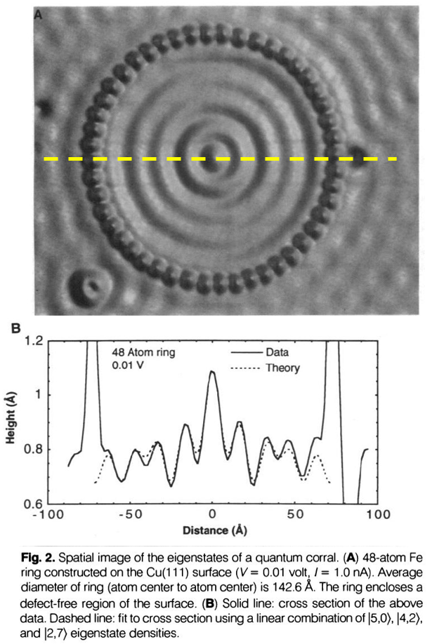 众所周知,1980 年代发展起来的扫描隧道显微术 (scanning tunneling microscopy, STM)是微结构与电子结构探测技术的一个里程碑。这幅图片描述的是该中心研究人员 M. F. Crommie 等人的一项实验观测结果。这里的样品是高度洁净而有序的金属 Cu 单晶 (111) 表面,呈现清晰的密堆排列。STM 技术具有在表面操纵单个原子移动的功能。此时,在这一表面沉积上零散的 Fe 原子,然后用 STM 针尖将这些 Fe 原子一个一个移动到某一个区域形成一个圆形或者其它形状的围栏。至此,样品制备即告完成。