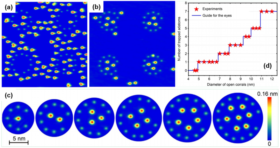(2)   应用上,可利用不同直径开口围栏内的二维量子尺寸效应来构建单原子精度的原子结构,实现最大限度抑制原子数目统计涨落,实现局域结构控制。