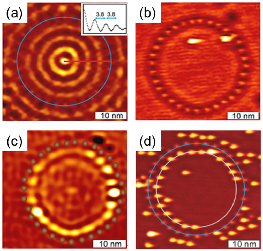 图5. 用量子围栏研究量子受限下的原子扩散。(a) 单晶 Ag (111) 上由 32 个 Fe 原子构建成的、直径为 30 nm 的圆形围栏。围栏内部的电子本征态密度振荡分布 (即量子波动干涉所致的干涉环) 清晰可见 (见插图),干涉环间距大约 3.8 nm,干涉环振幅由中心向外不断减弱。(b) 两个 Gd 原子 (两个耀斑点即为其位置) 通过电子束蒸发沉积到围栏内,相距大约 7.0 nm。32 个 Fe 原子构成的围栏衬度清晰可辨。(c) 在不同时间内随机采集 500 多幅图像,然后将这 500 幅图像叠加起来,就形成了这两个 Gd 原子的位置概率分布图。这里,亮度越高表示此处 Gd 占据的概率越高。仔细辨认,可以看到 Gd 原子分布呈现三个圆环,越靠近 Fe 原子围栏,圆环亮度越高。越靠近中心的圆环衬度越暗,难以分辨。(d) 在围栏内部放置 20 个Gd 原子,一段时间后可以看到这些 Gd 原子会在靠近围栏内测形成一个不闭合的圆环 (图中用高亮的细线将环连起来,以便辨认;外侧的蓝线标识的是 Fe 原子围栏)。结果来自文献 [Phys. Rev. B 87, 085415 (2013)]。