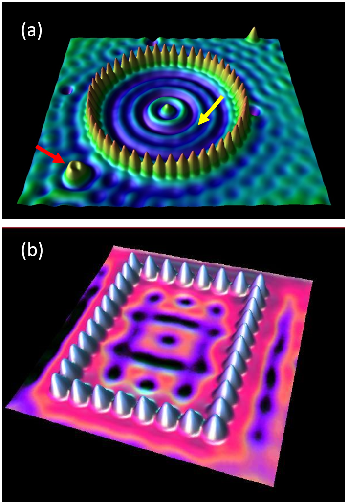 图1. 量子围栏 (quantum corrals) 的 STM 图像。图片 (a) 中,样品是高度洁净和原子级平整的 Cu (111)表面,表面上有一个圆圈形围栏,乃由 48 个 Fe 原子组成。圆圈平均半径为 7.13 nm,相邻 Fe 原子之间平均距离 0.95 nm。红色箭头所指乃一个孤立的 Fe 原子位置,黄色箭头所指乃围栏内形成的“波动干涉”般花样。图片 (b) 乃量子围栏的另外一个例子。