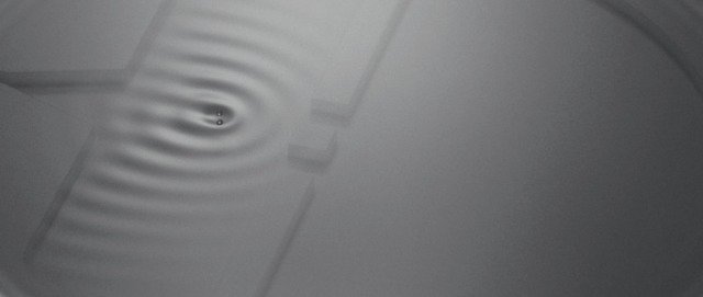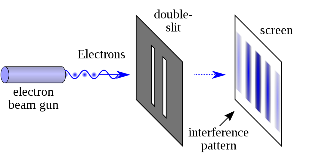 一些电子通过某种装置被发射。电子通过两条小缝,然后它们撞击缝后的屏幕(见上图)。我们在屏幕上看到的是这样一种图案:只有当我们认为电子是波时,我们才能解释得到的图案。