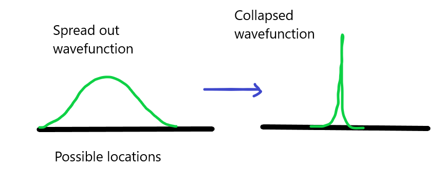 哥本哈根解释告诉我们,当我们对波函数进行测量时,除了一个特定状态的概率外,其它所有的概率都变为零,被测量到的状态概率变为1。这确保了电子有一个固定的位置,而不存在于其他任何地方。这种一个特定状态的概率变为1,其他概率都变为0的过程被称为波函数塌缩