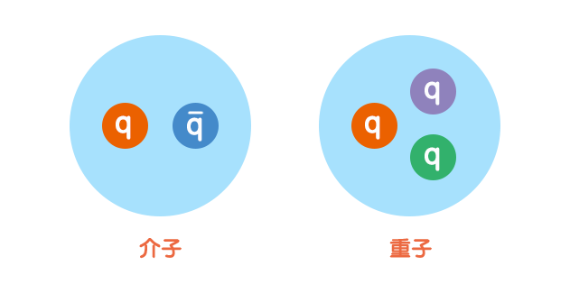 根据基于对称性的一些简单规则,夸克可以互相结合,形成一种名为强子的复合粒子。强子又包括由一个夸克和一个反夸克组成的介子,以及由三个夸克结合在一起的重子,我们熟悉的质子和中子就都是重子。