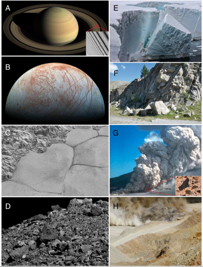 各种尺度上的碎片:A)由冰构成的土星环;B)木卫二的碎裂表面;C)冥王星上的多边形裂缝;D)小行星贝努上的碎石;E)地球上的冰山瓦解;F)地球上的岩石崩落;G)火山爆发产生的火山碎屑流;H)矿山爆破。| 图片来源:Domokos et. al. / PNAS
