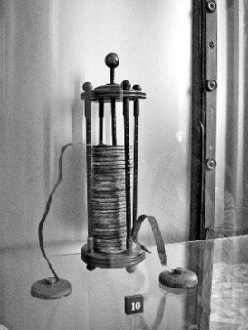 伏特(Count Alessandro Giuseppe Antonio Anastasio Volta,1745年-1827年),是意大利的一名物理学家。在伏特之前,人们只能应用摩擦发电机,再将电存放在莱顿瓶中储存,以供使用。这种方式相当麻烦,所得的电量也受限制。1800年,已经55岁的伏特发明了伏特电堆,其实就是电池,不过在早期是被称为“电堆”,这可能跟它的形状有关(如下图所示)。伏特的这项发明使得电的取得变得非常方便。