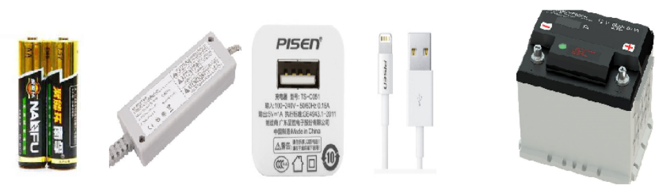 图13:从左往右依次:7号电池、笔记本充电器、手机充电器、汽车电瓶