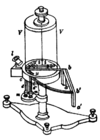 库仑所用的装置如下:一个玻璃圆缸,在上面盖一块中间有小孔的玻璃板。小孔中装一根玻璃管,在玻璃管的上端装有测定扭转角度的测微计,在管内悬一根银丝并伸进玻璃缸内。悬丝下端系住一个小横杆,小横杆的一端为木质小球A,另一端为平衡小球,使横杆始终处在水平状态。玻璃圆筒上刻有360个刻度,悬丝自由松开时,横杆上小木球A指零。