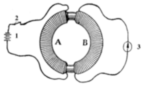 法拉第在对奥斯特实验进行详细研究后,一直在思考,既然电能产生磁,那么磁也应该能够产生电,但是如何才能够实现呢?终于在1831年8月,法拉第做了一个装置,如下图所示。
