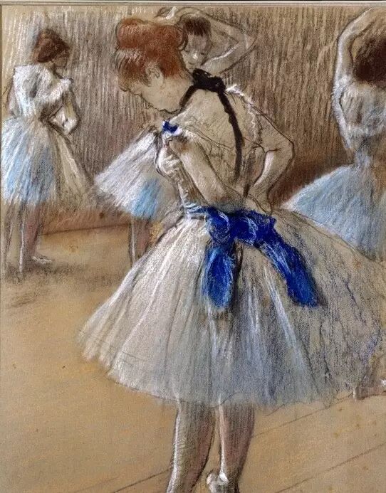 在德加的作品里可以看到“快照”的味道。现在的艺术史常把德加算作印象主义画家,事实上他只是与莫奈、马奈等比较熟悉,常常一起在咖啡馆里争论不休而已。与印象派画不同,德加从来不在户外作画。他那些关于户外赛马比赛的作品,都是参照从摄影师处购买的照片而画的,并非当场所画的速写。芭蕾舞演员是德加最热衷描绘的题材,他不仅表现小演员在舞台上的风姿,也记录她们离开舞台后的活动:系鞋带、排练……(图4)
