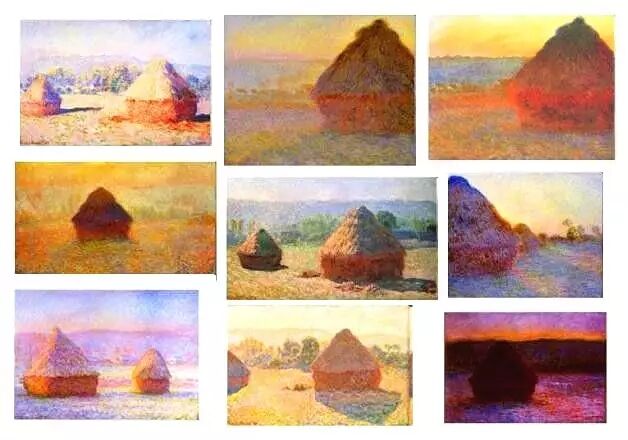 其三,莫奈的绘画实践真切体现了他的科学态度:他不仅坚持户外写生直到作品完成。为了客观地记录大自然的光、色变化,他常常摆开阵势,同时架起好几块画板,根据光照的不同分别写生记录。一次朋友来访,恰好他在准备作画,朋友问为什么还不动笔?莫奈答道:“时间还没有到。”朋友好生奇怪,难道作画也有开始的时间?事实上,莫奈的意思是光照还不够强,他在等太阳再升高一点。所以一些看起来平凡的主题,如“干草堆”都被他画上了25遍。