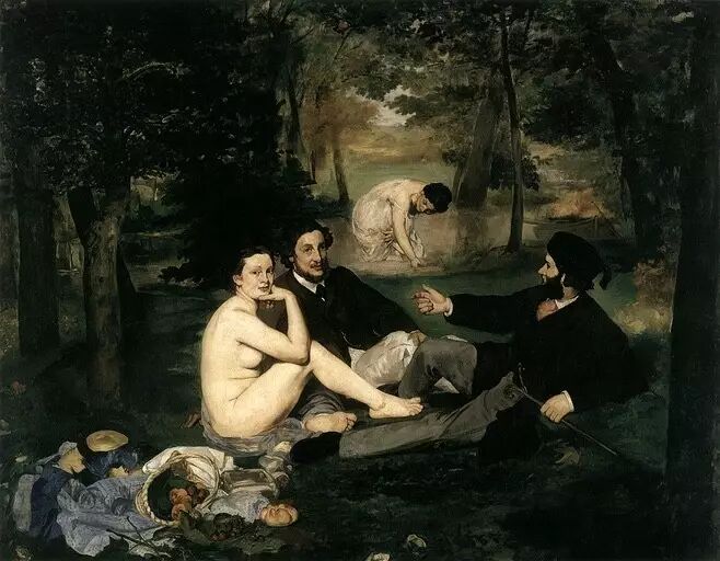 但是,虽然与莫奈、德加等人常常在一起玩得很好,也喜欢到户外作画,但马奈并不能够算是印象派画家。因为一心希望能够得到官方沙龙承认,马奈并没有参加印象派自办的画展。他为了能够吸引评委的眼球,画了两幅离经叛道的作品《草地上的午餐》(图1)和《奥林匹亚》,(前者落选,后者入选),想不到不仅没有人点赞,反而引来了舆论一片哗然,拿破仑三世看到图1也拂袖而去。
