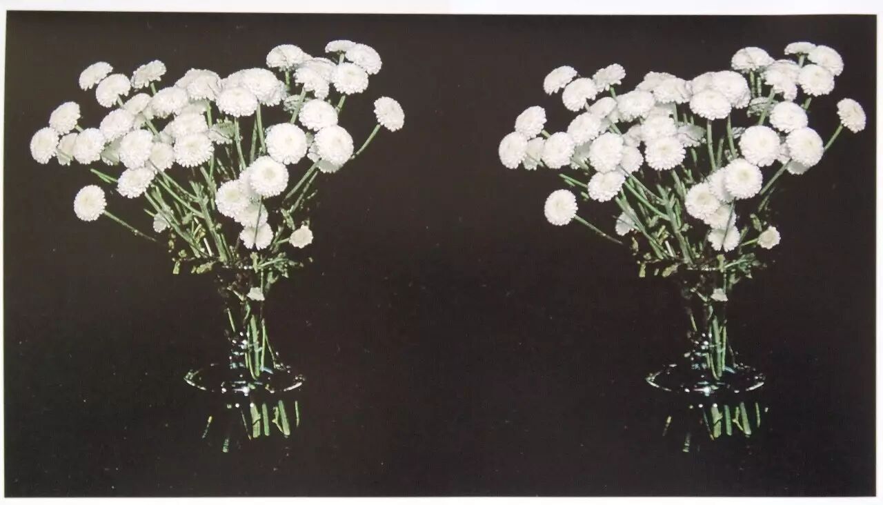 大多数读者经过练习可以看到这瓶虽然模糊、但立体感很强的菊花图像。事实上,我们观看三维立体电影,用的也是同样的原理:用两架摄像机在相距几厘米的地方同时拍摄,然后把它们同时放映,观者带上立体眼镜(通常是不同的偏振片),让左右二只眼分别看到了不同的图像,于是大脑把这两幅具有“双眼视差”的图像融合起来,立体感也因此产生了。