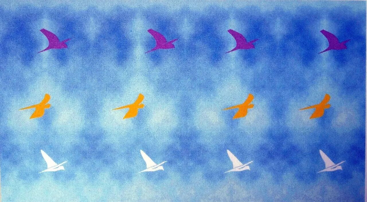 图10是一种做室内装饰的墙纸,倘若我们盯着它看一会儿,就会觉得眼花缭乱,墙纸上的飞鸟都动了起来,组成了一群三维立体的鸟群。让我们取墙纸的第一行紫色飞鸟来分析,请注意这个图案的特点:一是视觉元素(指小鸟)排成一条水平线(视觉对水平的感觉比垂直的敏感得多)。二是这些视觉元素(小鸟)都是重复出现的。