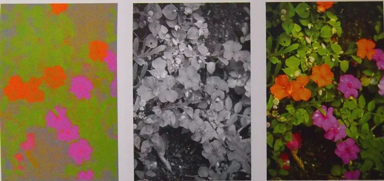 图14. 照片(左)只有花草色彩变化的信息,难以确定它们的空间位置;(中)只有花草位置的信息,容易确定它们空间和细节;(右)花草的全色彩图像,保存了花草的色彩和位置的全部信息。