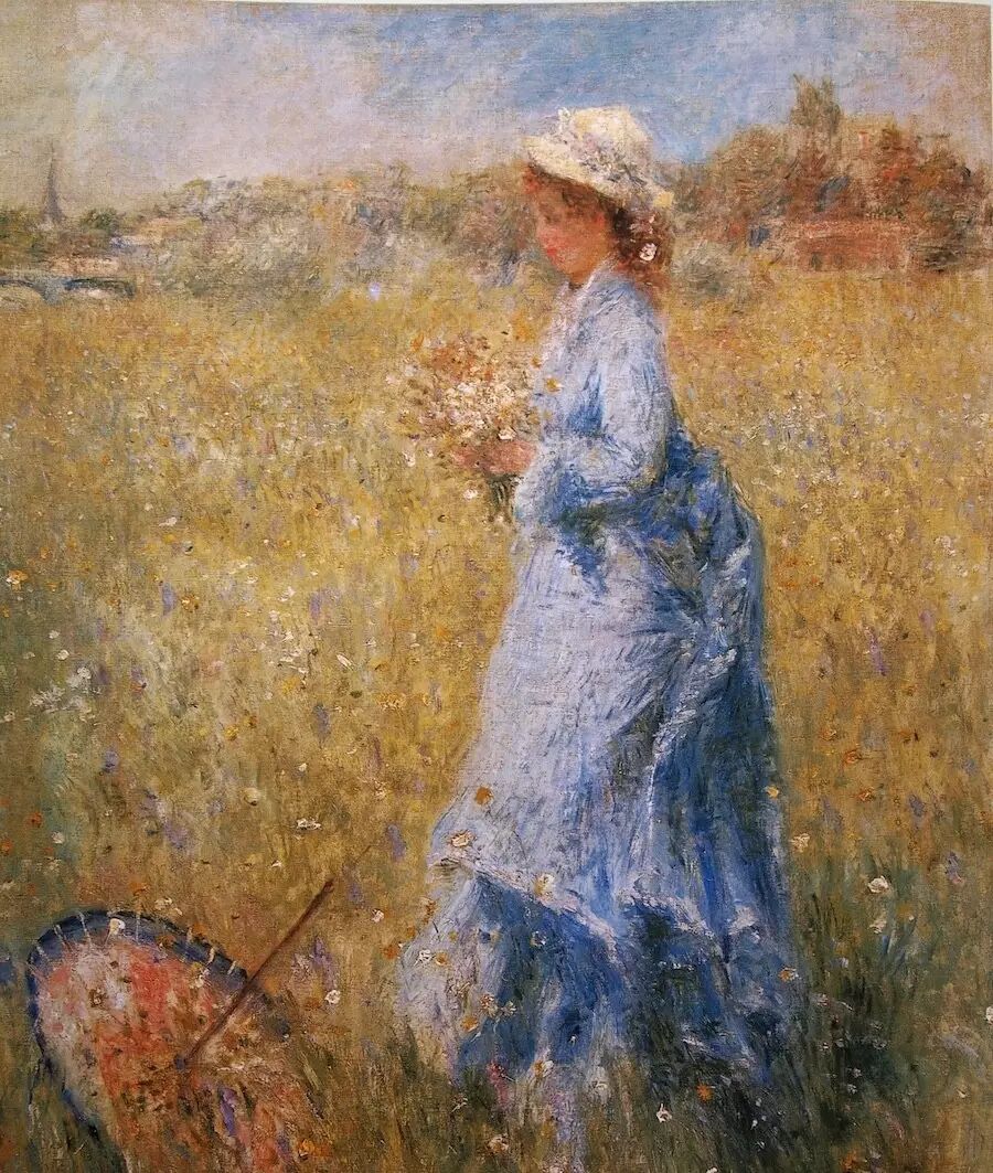 图13是雷诺阿的作品《拿花的女孩》,画上彩色的斑斑点点,自然会被观赏者错误搭配,导致产生一种很强的立体感,许多小东西如花瓣、昆虫和花粉好像浮在画面上一般。