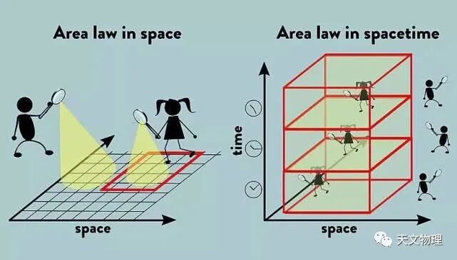 “面积定律”大致指的是爱丽丝和鲍勃测量结果相互关联的程度是由分隔爱丽丝和鲍勃区域的边界面积决定,而不是由区域的体积决定。这有点令人惊讶,因为许多其他热力学量或信息量,如能量或熵,通常是随体积而不是考虑区域的面积缩放。