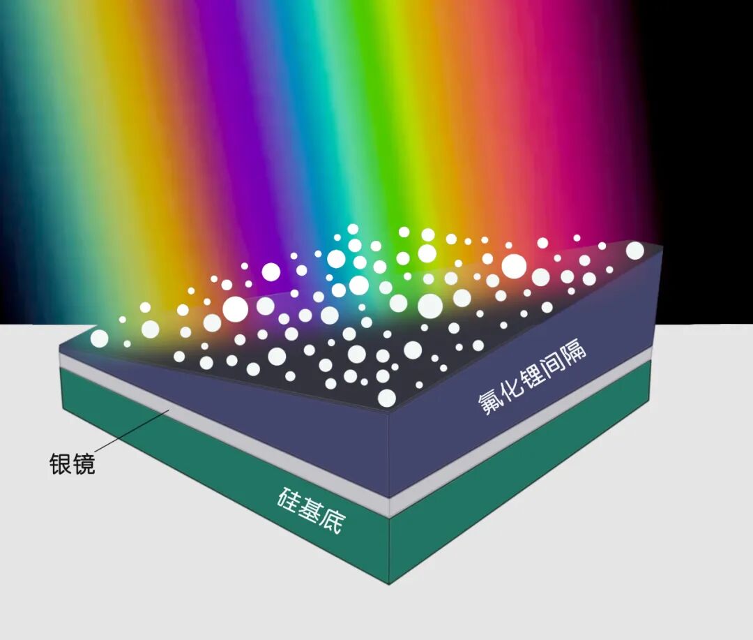 ○ 纳米级的银粒子颗粒在沿对角线逐渐变化厚度的透明腔体层之上。| 图片参考来源:[1]