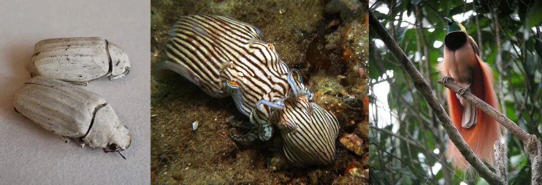 ○ 从左到右:白金龟、条纹睡衣鱿鱼、极乐鸟。| 图片来源:Wikipedia