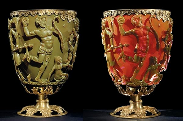 其实,古代的艺术家们就已经用他们的技艺为我们呈现过类似的颜色控制。一个经典例子是4世纪的罗马莱克格斯杯,这是一件由双色玻璃制造而成的工艺品,当光从正面照射时,它呈现出绿色;当光线从背面照射时,它呈现出红色。