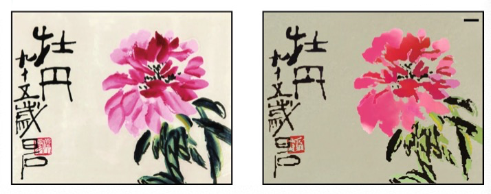 ○ 研究中重现的齐白石画作《牡丹》,左边为原始作品,右边为重现作品。| 图片来源:[1]