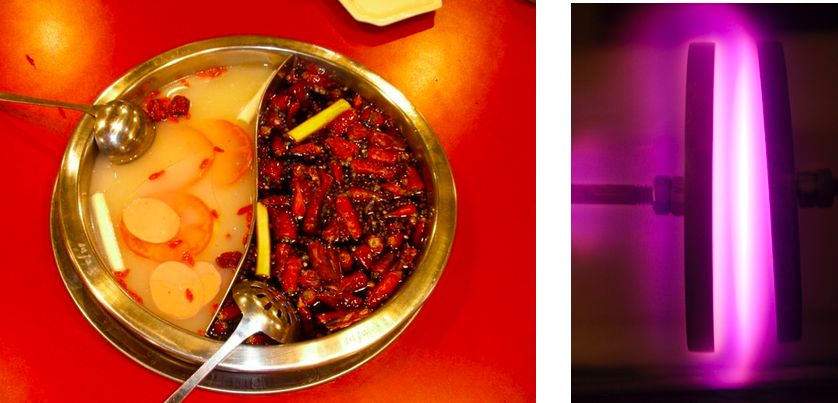 若一个体系虽然其整体上不是处于热平衡态,自然用单一温度参数描述是不恰当的,但组成它的子系统却是各自近似地处于平衡态,则对这样的体系可以针对子系统定义出一组温度来表征其热力学特性。平衡态的等离子体,如果不是太严格的话,还有鸳鸯火锅 (图8),就是这样的热力学体系。对平衡态等离子体,可以根据离子能量分布和电子能量分布分别定义离子温度和电子温度。如果也用Kelvin温标的话,一般气体的离子温度,近似地可看作是主导等离子体同环境交换热量的参数,并不比室温高多少。但是,电子温度要高得多,一般在105K以上,这样的等离子体被称为non-thermal plasma;若是等离子体内电子和离子是处于热平衡 的,则是thermal-plasma。Non-thermal plasma 有人将之翻译为非热等离子体,有人则随手使用低温等离子体这个译名。利用激光等更具选择性的离化工具可以使得气体中中性原子和离子的温度保持很低,比如维持在1K温度的水平,这样的等离子体被称为cold plasma 或ultra-cold plasma.