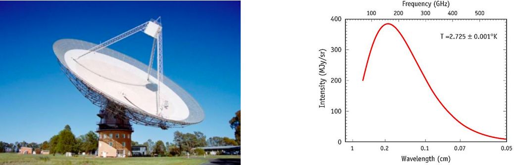 [6]。这个公式当然是严格的数学表达,对应一个温度的不再简单地是个数值,而是一个分布函数。同上述绝对温度定义一样,这里温度的确定还是通过能量测量实现的。对于具体的一个辐射体,比如宇宙(9),它的辐射能量密度谱估计不是像这个数学公式那么完美,但重要的特征(features)却不会有太大的偏离(图6)。这样,我们只要将 曲线美化成符合上述公式的形式,就能定义一个绝对温度。宇宙背景辐射、星体温度就是这样确定的。对黑体辐射公式的近似定义了绝对温度,或者说黑体辐射理论为我们提供了一个绝对温度计的数学基础,测量黑体辐射谱的设备就成了普适的温度计,且这种绝对温度计是远程的。利用此原理的绝对温度计之一,大型射电天文望远镜 (图6),为天体物理、宇宙学、引力理论的研究提供了巨大的帮助。
