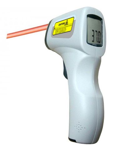 大型射电天文望远镜这样的绝对温度计太昂贵了,目前已有多种不太严格的—只测很窄范围内的波谱,或者其依赖的判据或计算也不严格—绝对温度计供实验室和日常生活中使用。这类温度计英文为pyrometer。例如,有一种灯丝消失光学测温仪(the disappearing filament optical pyrometer):通过一个红色(几乎单色)的滤光窗口将待测的白炽光源和仪器内置的灯丝(校准过的)发出的辐射一起比较,当辐射源的强度和灯丝的强度一样时,灯丝的像消失了,由此可以判断辐射源的温度就是内置灯丝的当前温度。这类温度计一般用于接近1000°C的高温测量,误差较大。还有一类测量红外波段发射谱或发射率(emissivity)的红外测温仪,英文为infrared thermometer或infrared radiation pyrometer 或 radiometer,由于其输出是蹦出一个表示温度的数字,因此也叫infrared thermoscope (图7)。由于emissivity 依赖于物体的温度,也依赖于物体表面的状况,因此这类温度计需要严格校准。