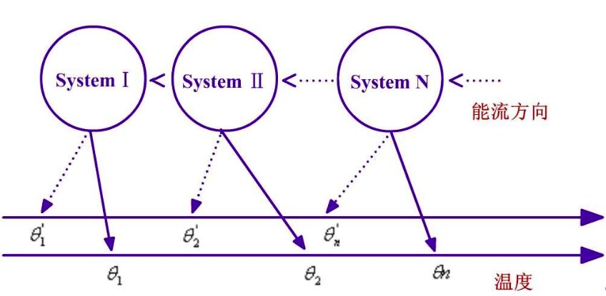 图4 平衡态体系之间热接触时能流的方向与温标的设定[4]。体系(θ1,θ2,… θn…)和体系(