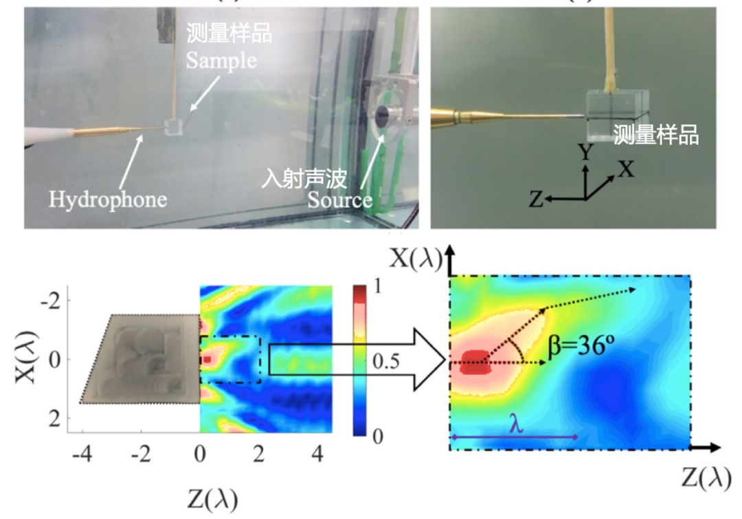 实验装置及测量结果:声波在样品中传播时向一个方向偏转,从而实现声钩。[2]