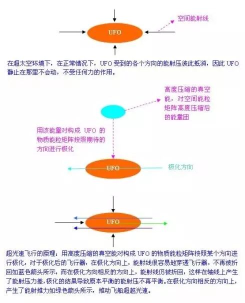 树上的苹果落到了地上,牛顿因此发现了外有引力,当树上的苹果再一次落到地上的时候,人类终有一天会发现,牛顿的万有引力是错的,不是物质固有的万有引力造成了苹果落地,而是苹果上面的能射压大于苹果下面的能射压,产生了能射压差,苹果是被‘压’下来的,那个时候,人类的科技才真正迈向了宇宙科技时代。当然外星人早已经迈入了宇宙文明的时代,外星人的时空旅行技术简单地说就是骑在能射线上漂流而已。怎么骑在能射线上呢?外星人通过特殊的技术将飞船‘极化 ’,将飞船沿着某个方向进行‘极化操作’,极化后的效果就是改变飞船上的某些方向上所受到的能射压,产生类似‘反重力’的效果。比如,当飞船停留在太阳的轨道上,如果不进行任何操作,飞船上会形成一个能射压差(即宇宙折回的能射线对飞船的能射压大于太阳释放的能射线对飞船的能射压),压差的方向指向太阳,这样,飞船早晚会被‘压’到太阳上去。按现在地球的解释就是被太阳吸引过去。但是如果对飞船进行‘极化’,使折回的能射线尽量多的穿透飞船,使折回的能射线对飞船的能射压尽量减小的最低。而此时使太阳释放的能射线尽量多的发生折射,使太阳能射线对飞船的能射压增大的最大。这个时候飞船受到的能射压的方法发生了转变,由原来的指向太阳变为背离太阳。这样,飞船就产生了所谓‘反重力’的效果。当然飞船可以在任何太空环境下都可以做么做,只要将飞船按某个角度极化,人为地造成某个方向的能射压,这样飞船就能沿着人们期待的方向驱动起来了。如果这种极化能作用到飞船内部的每一个原子上,此时惯性作用消失了,几万个 G的过载飞行都不成问题。极化飞船所用的能源正是取自于空间的能量。