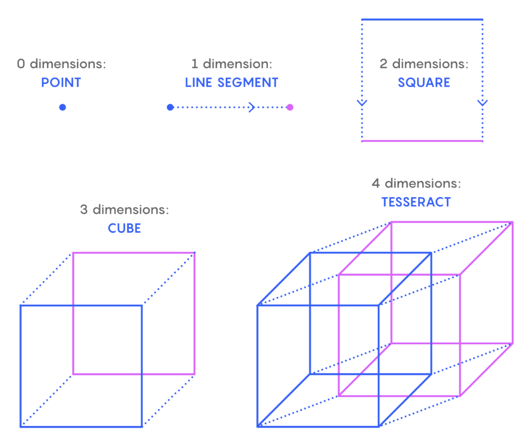 比方说,让我们试着在4维空间中构建一个立方体的等价物体,即超立方体(tesseract)。如果一开始有一个点,我们可以把这个点沿着一个方向进行“扫描”,这样就得到了一条线段;将这条线段沿着与之垂直的方向“扫描”,可以得到一个正方形;以此类推,我们可以得到一个3维的立方体和一个4维的超立方体。
