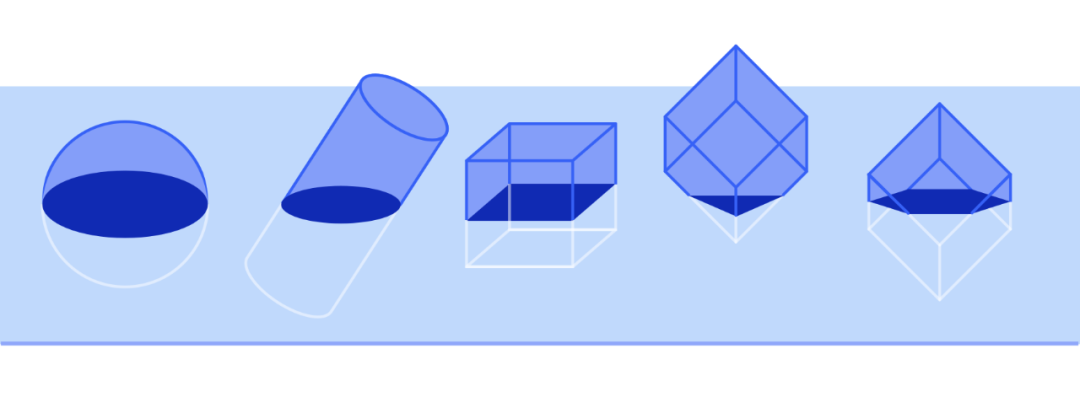各种3维图形与2维平面相交的情况。生活在平面里的“居民”只能看到3维物体的横截面。(图片来源:Samuel Velasco/Quanta Magazine)