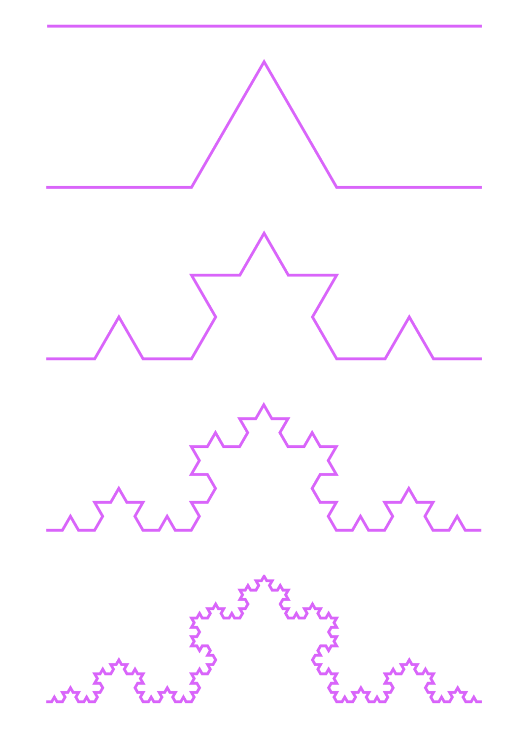 根据豪斯多夫的定义,我们会得到一个意外的结果:物体的维度可以不是整数。几十年后,这恰恰为贝努瓦·B.曼德尔布罗(Benoit B. Mandelbrot)的问题给出了答案。当时,曼德尔布罗正思考大不列颠岛的海岸线有多长。海岸线可能会相当参差不齐,无法用尺子精确地测量其长度——尺子越短,测量越精确,但同时测量的工程也会越浩大。曼德尔布罗认为,豪斯多夫的维度定义提供了一种量化海岸线“粗糙度”(jaggedness)的方法。1975年,他造出了“分形”(fractal)这个术语来描述这类复杂的无穷图形。