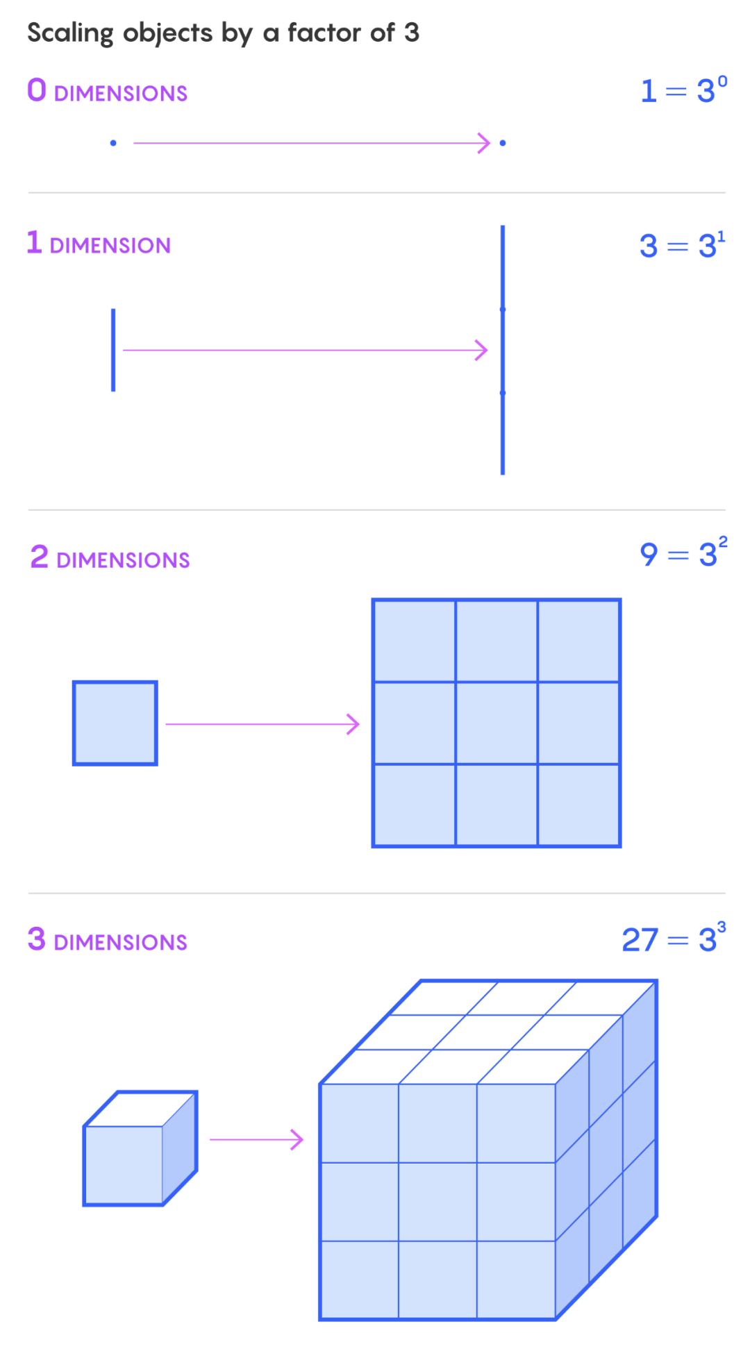 对维度的探索并未止于布劳威尔的发现。短短几年后,费利克斯·豪斯多夫(Felix Hausdorff)提出了维度的一种定义。几十年后,人们意识到这一定义对于现代数学是必需的。有一种方法可以帮助我们直观地理解其定义:如果把一个d维的物体均匀地放大为原来的k倍,那么这个物体的大小就会变为原来的kd倍。例如,如果我们把一条线段、一个正方形和一个立方体放大为原来的3倍,那么点的大小不会改变(30=1),而线段长度、正方形的大小和立方体的大小分别变为原来的3、9和27倍。