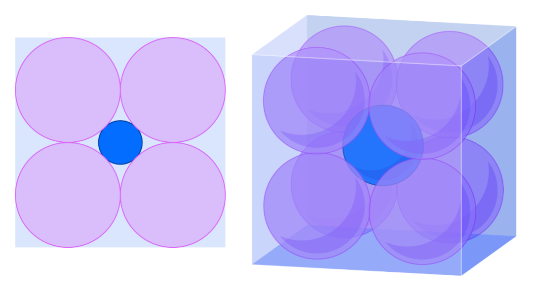 一个正方形内放入了5个圆(左)和立方体内放入9个球体(右)的情形。随着维度增加,中心的球体会逐渐增大,最终立方体将无法容纳它。