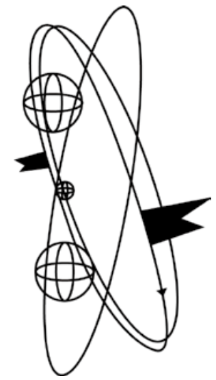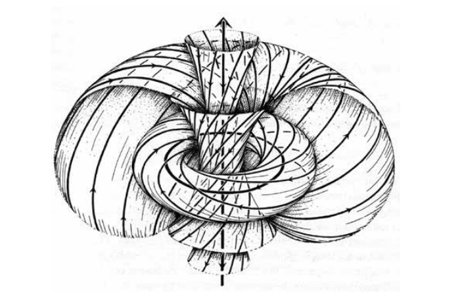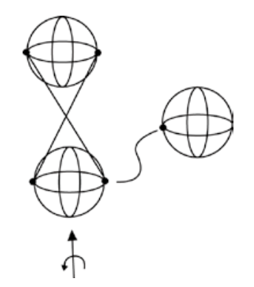 另一种将光锥紧化的方法,是在闵可夫斯基空间(Minkowski space)中添加一个无穷远光锥(图 7)。添加一个无穷远元素,是射影几何封闭一个空间的既定技巧。这种紧化的结果,构造了复射影三维空间。彭罗斯意识到,由闭环组成的紧化光锥是三维球面(球面的四维类似物)的霍普夫纤颤(一组链接的圆)。这是一个久已为人所知的数学事实,即在三维球上的某些平行路径随着它们的推进而扭曲。彭罗斯认为,这一几何事实必须解释无质量粒子自旋的起源,尽管所有的细节还没有搞清楚。为了界定光线扭转的方向,光线的描绘必须有一个附加的结构,而这是通过添加旗子来实现的:把光线看作旗杆,把旗子看作附在旗杆上的刚性信号旗(图8 )。(旋量,即随它们推进而旋转的矢量,就是这样被描述的,而扭量则以旋量数学为基础。)现在可以跟踪零射线(零长度的光线)的扭曲,并将其看作紧化的必然结果,紧化本身就是在其自身参考系中具有零长度,从而成为一个射影实体的光线的必然结果。