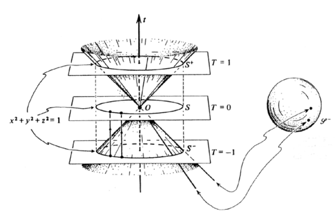 图3 彭罗斯画的光锥。光锥表面上的直线代表以光速行进的路径。相对论表明,对于旅行说,这些路径的长度为零;它们是零射线,也可以用球面上的点来表示。