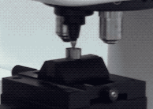 讲起这个钻石的「最硬」,实在是我们好像下意识就会觉得「硬的东西就代表牢固」...其实机械上的定义硬度是说「材料抵抗更硬物压入其表面的能力」。下图是我们测维氏硬度的检测仪器,就是压,死命压,然后看压痕的形变,测出来一个数值,代表的就是硬度值了。
