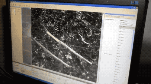 用显微镜的话,能看到原石放大后的瑕疵,比如下图的羽裂纹。如果再配合上 3D 建模,就能更清晰的看到这几条羽裂纹对整体切割方案的影响。