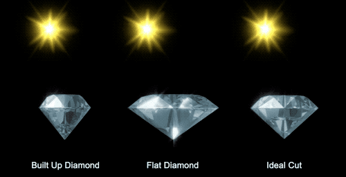 我们说的璀璨,主要就是说火彩、亮度和闪光的相互配合。「火彩」是说白光进入钻石后被折射析出七色光;「亮度」指的是白光进,白光出的折射和白光在钻石刻面的反射;「闪光」就是一颗钻石闪烁的总次数了。看下图,钻石切割的角度(不是大小),对光的折射和反射有直接的影响。