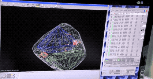 一颗原石被切割成钻石之前是需要分析的。根据石头的形状大小以及内部缺陷,考虑很多不同的分离组合,以实现钻石商的利益最大化。过去技师只能凭借多年的操作经验,现在则方便多了,在扫描仪和显微镜配合下,把原石扫进电脑里再建模,像下图的紫色和绿色就是不同切割方案的选取。
