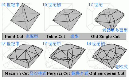 不管你看过哪一本《钻石大全》,下面这张钻石切型历史图多少都见过一些,我就给汉化了一下...像马沙林式,是以发明出有 17 个冠部刻面和 17 个亭部刻面的法国红衣主教马沙林的名字命名的;佩鲁齐式,是以发明出有 33 个冠部数量和 25 个亭底刻面的威尼斯抛光师的名字命名的;而 18 世纪初的老欧式,这就很接近我们现在普遍见到的明亮式切割的前身了。