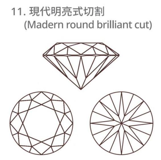 到 1919 年,钻石切割发生了革命性的创新,比利时数学家陶可斯基(Tolkowsky)提出了「理想切割比例」,能让钻石的白光和散发出的火彩更平衡,并不只是让光在钻石中折射后更炫目。在此基础上,经过了后人几十年的不断调整优化,才有了现代的钻石切型比例,也就是下图的明亮式圆钻切割(Madern round brilliant cut),广告里一般展现的就是这种钻石了。