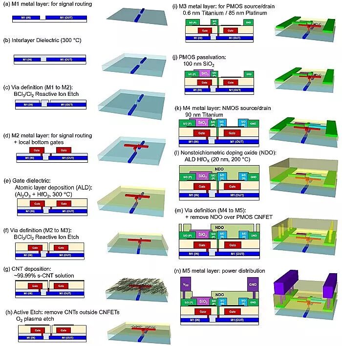 MIT研究者制造的RV16X-NANO,是目前实现的最大的非硅基CMOS系统,包含3762个CMOS数字逻辑,总计14702个CNFET。令人震惊的是,RV16X-NANO的制造工艺包括100多个加工步骤,实现了五层金属层的三维结构,有望改善布线拥挤的问题。作者对制造方法进行了详细的介绍,内容多达70多页。