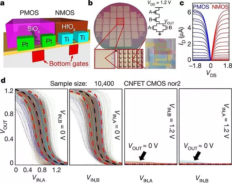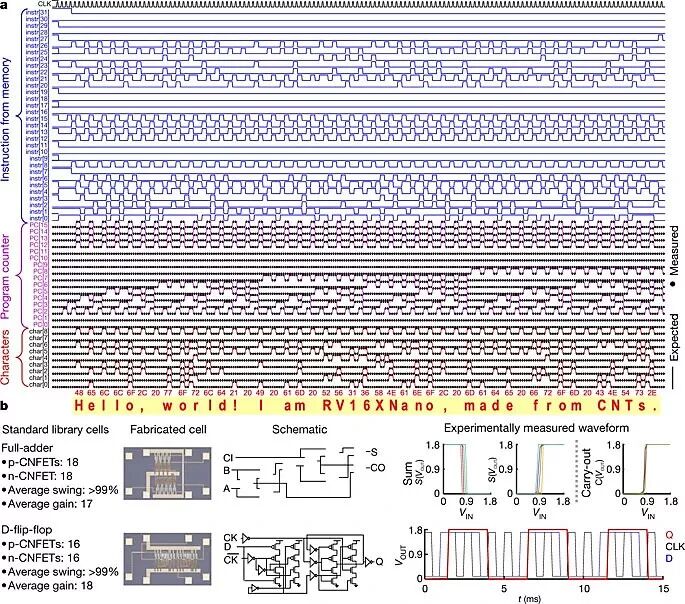 Modern microprocessor built from complementary carbon nanotube transistorsGage Hills, Christian Lau, Andrew Wright, Samuel Fuller, Mindy D. Bishop, Tathagata Srimani, Pritpal Kanhaiya, Rebecca Ho, Aya Amer, Yosi Stein, Denis Murphy, Arvind, Anantha Chandrakasan, Max M. ShulakerNature, 2019, 572, 595–602, DOI: 10.1038/s41586-019-1493-8