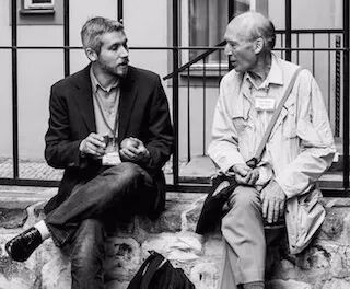 图1:蒂姆·科斯洛斯基与朱利安·巴伯在布拉格召开的百年爱因斯坦会议上(Credit: Jakub Haláček)