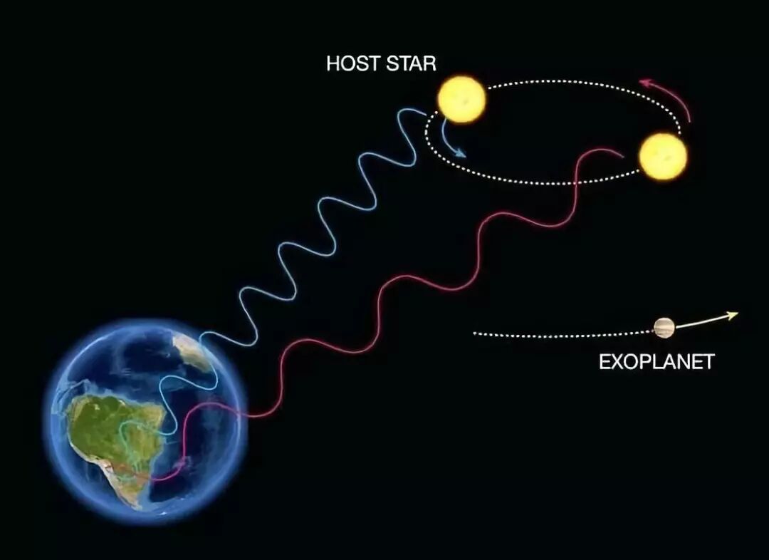 由于在彼此旋转,当行星离地球远去时,恒星就会略微地靠近地球;此时,恒星发出的光就会发生轻微的蓝移。反之,当行星向地球飞来时,恒星就会略微地远离地球;此时,恒星发出的光就会发生轻微的红移。这样一来,如果一颗恒星的周围真的存在一颗行星,这颗恒星的光谱就会出现周期性的蓝移和红移交替的现象。换言之,如果发现一颗恒星的光谱出现了周期性的蓝移和红移交替的现象,就可以断定这颗恒星拥有一颗行星。这种探测系外行星的方法就是径向速度法。
