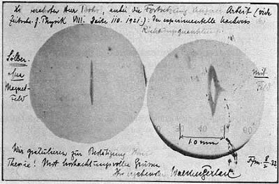 图1. 著名的Stern-Gerlach实验,一束银原子经过非均匀磁场后总是被分为了两束(1922)