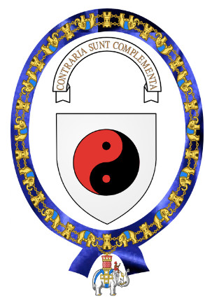 图 4: 在 1947 年获得丹麦最高荣誉 Order of the Elephant 时,玻尔为自己设计的纹章。 其主体采用了中国传统的太极图;上方写有拉丁文  Contraria sunt Complementa,英译为 Opposites are Complementary, 汉译可为相反相成。