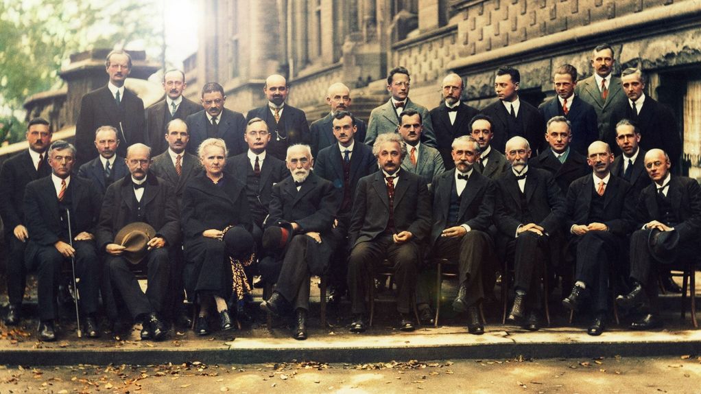 图 5:1927年10月于比利时布鲁塞尔召开的第五次索尔维会议合影。 此次会议主题为“电子与光子”,是 专门为讨论新近建立的量子力学而举行的。虽然量子力学基本框架得到了广泛的认同,但就量子力学的诠释问题,会上的两位主角爱因斯坦与玻尔产生了激烈的交锋,这拉开了几乎持续了数〸年的所谓 “玻尔-爱因斯坦论战” 的序幕。图中几乎所有人都对量子力学或现代物理做出了重大贡献,下面列出他们每一个人的名字,以示崇高的敬意与铭记。每排皆按从左至右排。第3排:奥古斯特·皮卡尔德,亨里奥特,保罗·埃伦费斯特,爱德华·赫尔岑,西奥费·顿德尔,埃尔温·薛定谔,维夏菲尔特,沃尔夫冈·泡利,维尔纳·海森堡,拉尔夫·福勒,莱昂·布里渊;第 2 排:彼得·德拜,马丁·努森,威廉·劳伦斯·布拉格,亨德里克·克雷默,保罗·狄拉克,阿瑟·康普顿,路易·德布罗意,马克斯·玻恩,尼尔斯·玻尔;第 1 排:欧文·朗缪尔,马克斯·普朗克,玛丽·居里,亨德里克·洛伦兹,阿尔伯特·爱因斯坦,保罗·朗之万,查尔斯·古耶,查尔斯·威耳逊,欧文·理查森。